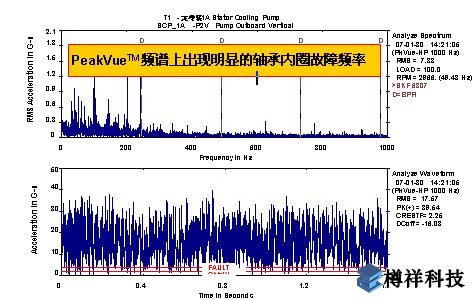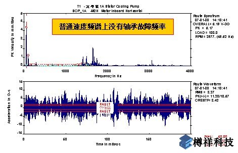 電機頻率為2950r/min(49.13hz),電機端軸承型號為skf6313,定冷泵端軸承型號為skf6307。采用加速度傳感器分別測量兩個軸承的軸承座外殼水平、垂直和軸向方向的振動量。測點位置如圖5所示。在進行普通的波形頻譜分析的同時,還利用了csi的***技術peakvuetm 對軸承進行狀態監測。