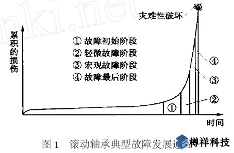 1. 1 滾動軸承故障發展的4 個階段***階段,即軸承開始出現故障的萌芽階段,這時溫度正常,噪聲正常,振動速度總量及頻譜正常,但尖峰能量總量及頻譜有所征兆,反映軸承故障的初始階段。這時真正的軸承故障頻率出現在超聲段大約20~60kHz 范圍。