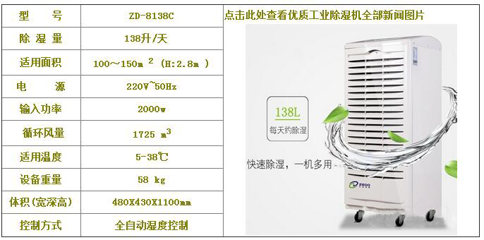 優(yōu)質(zhì)工業(yè)除濕機適用面積100-150m 2 左右,除濕量為138升/天,廣泛應用于醫(yī)院以及生產(chǎn)車間,銀行金庫,檔案資料,圖書館,精密儀器室,貴重物品倉庫等場所。