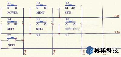 由于ST20P18的I/O口有限,故在鍵盤電路中采用掃描的方式來實現(xiàn)。該電路的實現(xiàn)方式如圖2所示。其工作的基本原理是:單片機初始化后先設(shè)置 PA0至PA5、6個I/O口均為輸入方式。