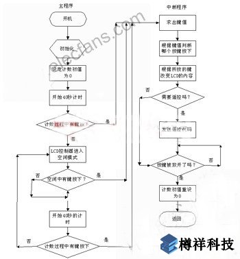 開機后,先進行初始化,包括對單片機的初始化、LCD的初始化和其他模塊的初始化。出于省電的考慮在40s內(nèi)若沒有鍵按下,讓單片機的LCD控制器進入空閑模式。用“for”循環(huán)來計時,并設(shè)計初值為零。