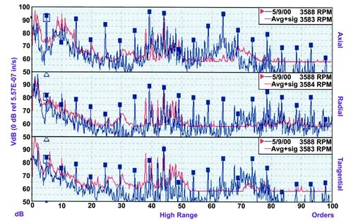 然后,計算平均加一西格瑪光譜掩模。據統計,大約85%的振動幅度應低于平均值加上一個西格瑪面罩。與供應商定義的通過/未通過標準或絕對標準(如IRD圖表)不同,相對標準允許機器本身定義可接受的內容。圖3是在該案例歷史中使用的相對接受標準的一個軸的示例。圖4顯示了低和***范圍數據的所有三個軸的平均和平均加西格瑪水平。如果800線譜中的一個或多個峰超過平均加西格瑪振幅標準,則僅這一事實并不表示存在嚴重問題(參見診斷策略部分)。