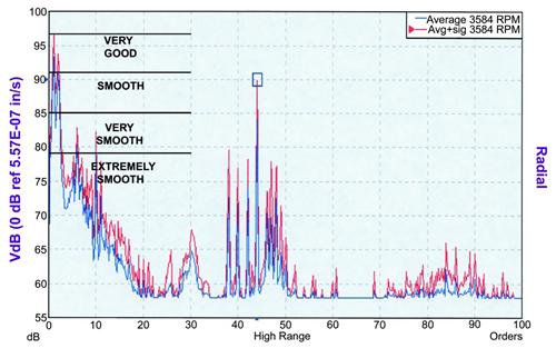 圖3.通過對來自12個相同冷卻器的光譜進行平均,專門針對1,250噸冷水機生成相對驗收標準。顯示的平均值(藍色底部光譜)和平均值加上一個標準偏差(紅??色頂部光譜)標準是徑向軸。IRD嚴重程度圖標準被疊加用于比較。