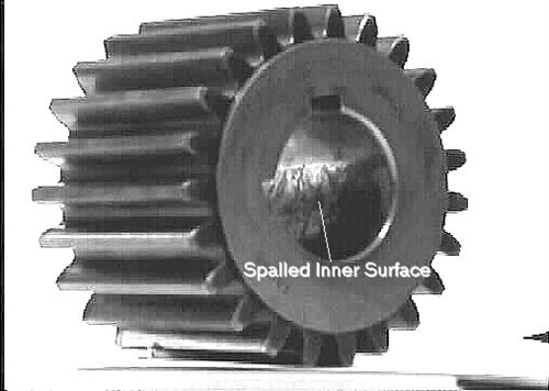 圖5.該照片顯示了齒輪在軸上來回轉動引起的小齒輪孔剝落。