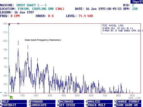 定期對齒輪箱中的潤滑油進行分析,***后的報告指出油中含有鐵顆粒。維護主管詢問我們是否可以確定油污染的來源,我們做的***件事就是檢查軸承附近測得的振動頻譜。光譜看起來很正常,沒有軸承色調的跡象,因此我們懷疑金屬來自一個或多個齒輪(見圖2)。然后問題是識別故障齒輪(如果有的話),以便能夠毫不拖延地進行維護工作。