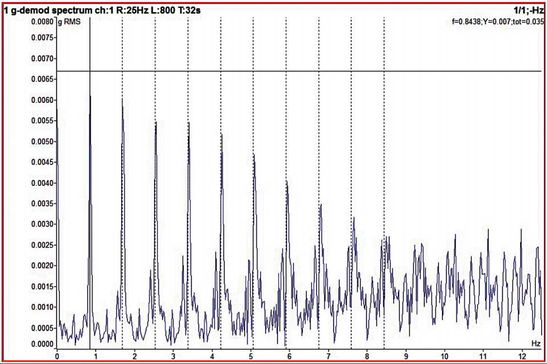 在圖2中,我們僅在25 Hz范圍內(nèi)測(cè)量了頻譜。該軸承的沖擊重復(fù)頻率約為1 Hz。在1 Hz附近看不到任何東西。如果要查看頻譜中的重復(fù)頻率,則必須應(yīng)用解調(diào)。這意味著,我必須補(bǔ)充精力。解調(diào)后的頻譜可以顯示可見(jiàn)的東西。解調(diào)頻譜使用包絡(luò)的時(shí)間信號(hào)。我們只想在500 Hz至25 kHz的頻段內(nèi)進(jìn)行測(cè)量。我們對(duì)低頻不感興趣。您可以想象包絡(luò)就像簡(jiǎn)單的電路:沖擊來(lái)了,給電容器充電,然后電容器通過(guò)電阻放電。放電時(shí)間比原始震動(dòng)的時(shí)間長(zhǎng)得多。這是在頻譜方面幫助我們的額外能量。確實(shí)有幫助。在第三張圖片中,您可以看到重復(fù)頻率0.85 Hz及其諧波。諧波總是會(huì)發(fā)生,因?yàn)榘j(luò)信號(hào)失真。這不是純正弦波,它只能顯示光譜中的一條線。我希望您在低速機(jī)器上進(jìn)行測(cè)量時(shí)會(huì)記得這篇文章,并希望您現(xiàn)在能夠更有效地檢查這些機(jī)器。